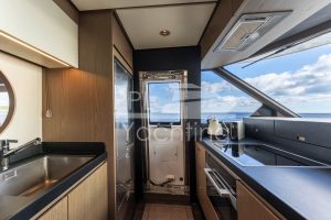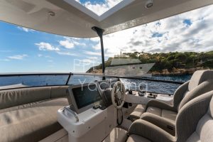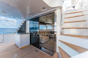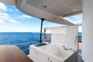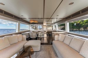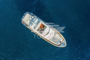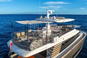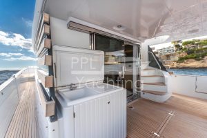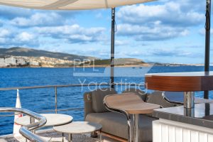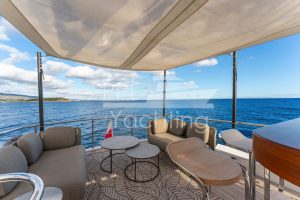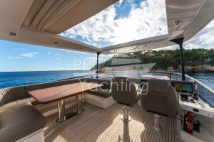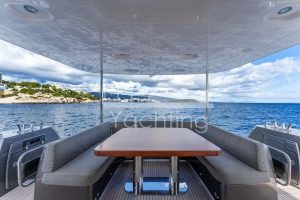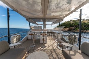 Auf der Flybridge – großzügig für bis zu 14 Personen gestaltet und von einem Hard-Top mit elektrischem Soft-Top überdacht -, zahlreiche Sitz- und Liegeflächen neben dem Steuerstand, eine Bar mit Außenküche, versehen mit Grill, Spüle, Kühlschrank und Eiswürfelbereiter, sowie eine offene Lounge mit Regenfalldusche am Heckbereich, für welche bei Bedarf ebenfalls ein Segeltuch / Bimini zur Beschattung vorhanden ist. Die Flybridge lässt sich ferner mittels eines Campercovers vollständig einhausen, sodass dieser Bereich an Schlechtwetter- oder Wintertagen geschützt, gleichzeitig aber auch nutzbar bleibt.