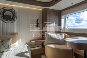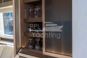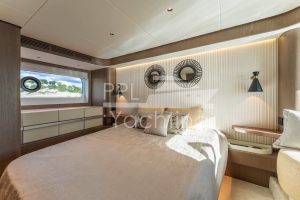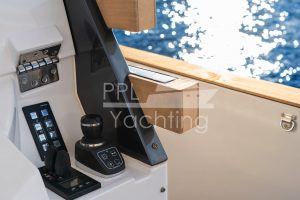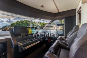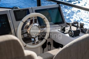 Kreisel-Stabilisationssystem (SeaKeeper NG16) vorhanden – Erhöhter Komfort nicht nur aufgrund der langen Liste von Sonderausstattung, wie der für die Tropen ausgelegten Klimaanlage in allen Kabinen, einschließlich der voll-ausgebauten Crew-Kabine am Heck, dem Frischwassererzeuger, der dritten Manöverstation am Heck oder dem elektrischen Kabel-Master, sondern auch aufgrund des installierten MAN-Manöver-Joysticks, der es ermöglicht, das Flaggschiff der Azimut / Benetti Werft auch bei schwierigen Wetterbedingungen stets kontrolliert zu halten.