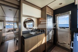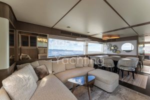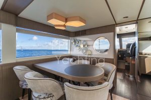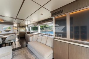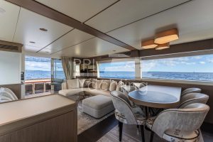 Auf Deckebene zum Eingangsbereich hin einen hellen und großzügigen Salon mit bequemer Sitzecke und elektrisch bedienbarem TV-Möbel (Smart Tv). Dahintergelegen, einen Esstisch für 6 Personen mit Durchreiche zur vom Wohnraum separierbaren Küche, welche neben der Kühl- und Gefrierkombination auch einen Eiswürfelbereiter beinhaltet und deren hochwertige Ausstattung vor allem aufgrund der von Miele gelieferten Küchengeräte besticht. Bequem an Deck / zum Vorschiff gelangt man sowohl von der Küche als auch vom Steuerstand aus mittels der Seitenluke an Backbord; Hier erwartet die Gäste eine in u-Form gestaltete Sitzecke mit Tisch und – je nach Bedarf – das leicht zu montierende Segeltuch / Bimini an schönen Sommerabenden.