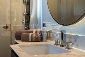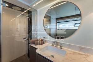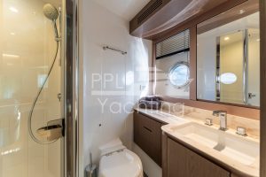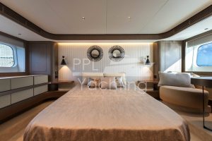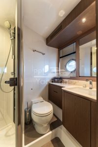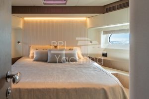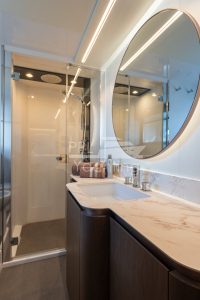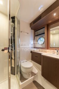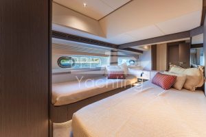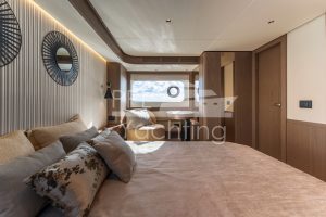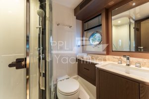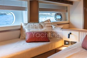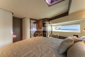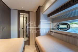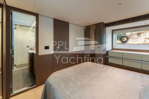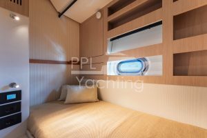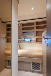 Unter Deck 2 Kabinen – Master und VIP – über die volle Schiffsbreite ausgelegt und mit großem Doppelbett wie auch je einem Badezimmer en suite ausgestattet sowie ferner eine 3te Kabine mit zwei Einzelbetten und Zugang zu einem zusätzlichen Badezimmer auf Steuerbordseite. Eine 4te Kabine auf Backbordseite, ausgestattet mit Stockbetten, ermöglicht es, für insgesamt bis zu acht Personen einen Schlafplatz an Bord vorzuhalten. Im zentralen, hellen Flur befindet sich neben der Staubsaugeranlage auch ausreichend Stauraum sowie eine Waschmaschinen-/ Trocknerkombination.