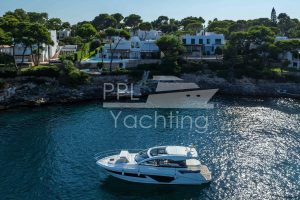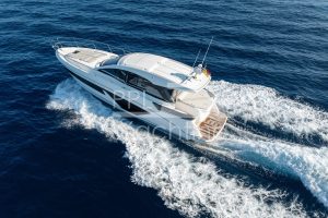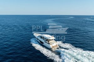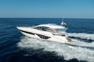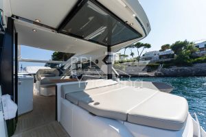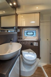 This yacht was fitted with teak decking and counts with almost full extras. In addition to the sun pad above the tender garage (suitable for 2.3m tender and fitted with an electric winch), the spacious cockpit area also offers an electro-hydraulic bathing platform (lifts up to 350kg tender / JetSki) as well as with an electric, teak-laid gangway. This GT45 provides on a total of 2 decks