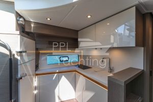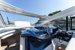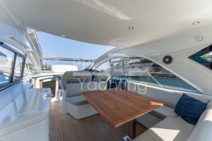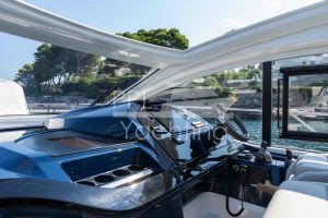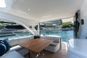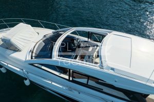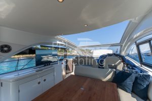 On deck level towards the cockpit there is a bright and spacious deck saloon – fully enclosed and air conditioned – with kitchenet and automatic Tv-lift to port side and seating / dining area with a teak table to starboard. To facilitate natural ventilation the deck saloon can almost be fully opened with the manually-operated side windows as well as the large, electrically-operated hard-top above the helm station and the glass cockpit door / window combination
