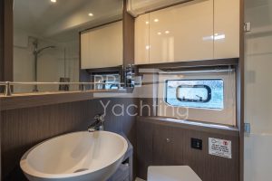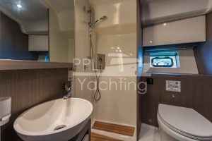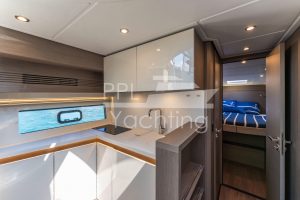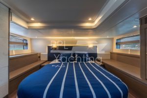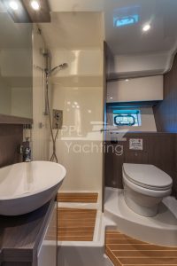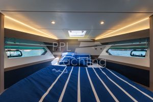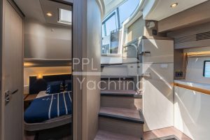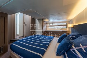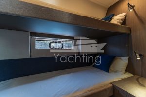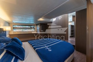 Below deck 2 cabins with a large double bed and each with an en-suite bathroom as well as a third cabin with bunk beds, accommodating up to six guest in total. In the companionway / lower galley a large fridge & freezer combination as well as a dish washer are found