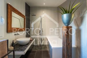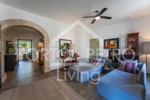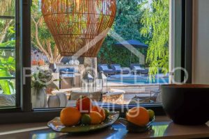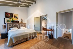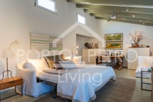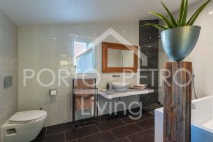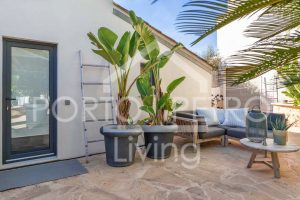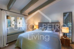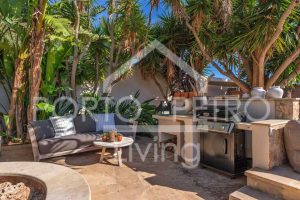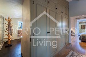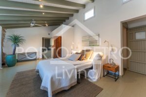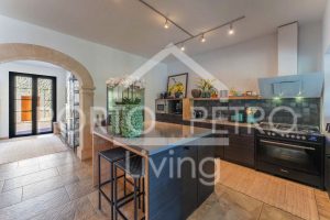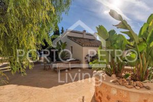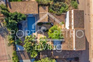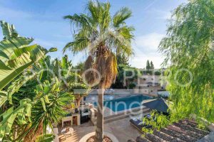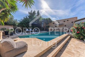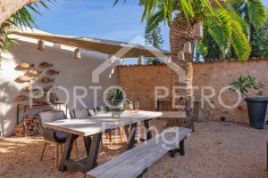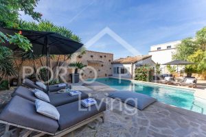 This exceptional village house is located just a few minutes from Santanyí and the most beautiful beaches of Mallorca’s southeast coast. Lovingly renovated, generously proportioned and ideally situated, it combines traditional mallorcan architecture with modern comfort. Featuring natural stone walls, carefully selected details and high-quality renovations, the property presents itself as a stylish retreat with authentic mediterranean charm – perfect for those who appreciate quality and character. A particular highlight is the spacious plot of approx. 530 m², boasting a beautifully landscaped garden that has been largely paved for easy maintenance. It is divided into several inviting terrace zones, including a barbecue area with a built-in worktop and sink, as well as various lounge areas, all surrounded by lush mediterranean plants such as palms, bird-of-paradise flowers and hibiscus. Heart of the outdoor space is an exceptionally large pool (approx. 33 m²) with a waterfall feature and a brick outdoor shower – creating a true oasis of relaxation. The property offers a built area of approx. 300 m², divided into a spacious main house and a separate guest house. You enter the home through a welcoming entrance area and cozy living room. From here, you continue into the modern kitchen with a central island and breakfast bar, fully equipped with a side-by-side refrigerator/freezer, dishwasher, microwave, and a 5-burner gas stove with wide electric oven – ideal for passionate cooks. Adjacent to the kitchen is the dining area, located in a beautifully designed winter garden, which can be – depending on the season – opened or closed to the patio-garden with elegant sliding glass doors. The ground floor also offers two single bedrooms, currently used as a dressing and an ironing room, a bathroom and a laundry. Upstairs, you are greeted by an impressive master suite with approx. 4-meter-high ceilings, exposed wooden beams, oak flooring, and large windows that flood the space with natural light. This area also includes a dressing room, an en-suite bathroom with bathtub, and a private balcony terrace overlooking the enchanting garden. A second spacious bedroom on the first floor, also with en-suite bathroom and high beamed ceilings, provides an equally inviting and elegant ambiance. Situated in the patio garden, the guest house offers an additional comfortable bedroom with modern bathroom – ideal for visitors seeking privacy. The property also includes a large garage with two separate entrance gates. Comfort is ensured year-round thanks to oil central heating with radiators, underfloor heating in the winter garden, and modern ceiling fans and air conditioning in the master suite area. The house is connected to the public electricity, water, and sewage network, and also features satellite TV for german channels as well as high-speed fiber optic internet.