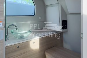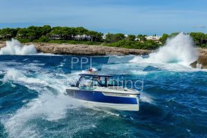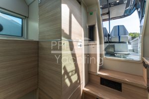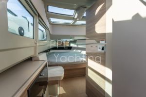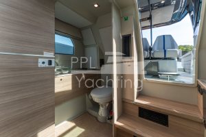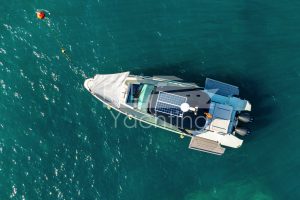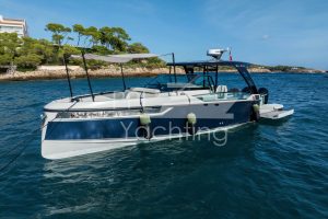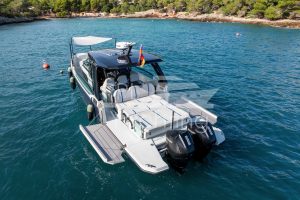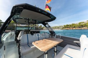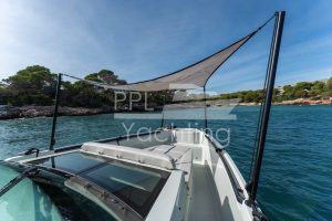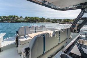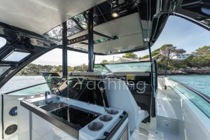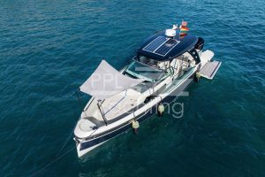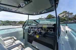 This 320 GTO is fitted with all amenities one could be looking for, among that a full navigation package including radar and auto-pilot, an electric anchor winch with stainless steel anchor, a mediterranean air-conditioning with Lithium battery supply and solar panel charging system, an inverter to provide 220V throughout the vessel as well as a small bathroom inside the generous cabin, fitted with toilet and holding tank, – thus all family members can enjoy the day at sea!