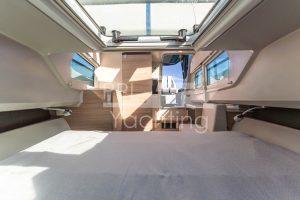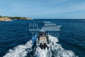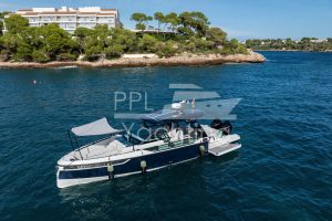 “El Cid” offers a blue wrapped hull with T-Top covering the helm and aft cockpit. Four poles allow connecting a mesh-cover to provide additional UV-protection also for the bow sun pad. Aft of the helm seats there is a wet bar with BBQ and sink as well as fridges to either side. The seating group / dining table can be easily converted into a large sun bed and the lateral, electrically operated balconies allow for an enlarged deck space when at anchor.