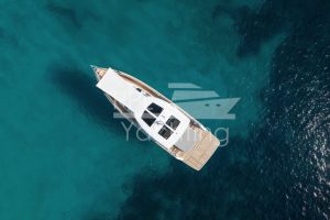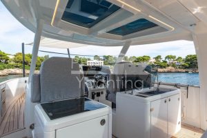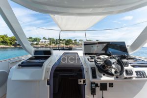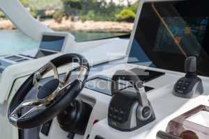 Kreisel-Stabilisierung (Quick Gyro X10) vorhanden – erhöhter Komfort an Bord nicht nur aufgrund der umfangreichen Ausstattungsliste, wie etwa der aufs Mittelmeer ausgelegten Klimaanlage in allen Kabinen, der hydraulischen Badeplattform mit integrierter, teak-gelegter Leiter sowie dem Wechselrichter zur Erzeugung von 230 V (ohne Generatorbetrieb), sondern auch durch den Volvo-Manöver-Joystick für die neuesten DPI Z-Antriebe von Volvo, der dem Skipper selbst bei anspruchsvollen Bedingungen präzise Kontrolle ermöglicht.