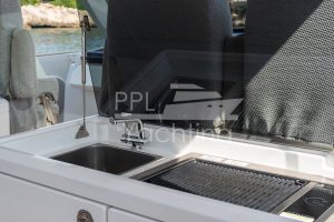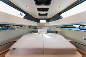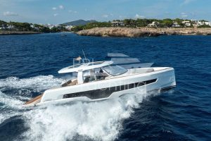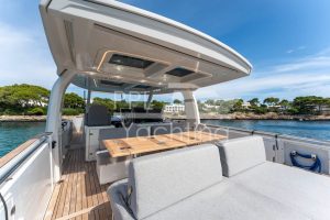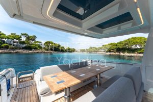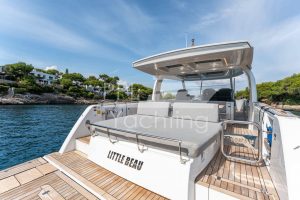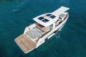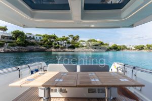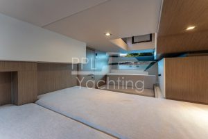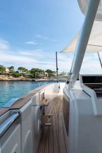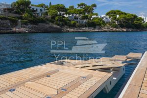 An Deck einen großzügigen Cockpitbereich, der – zusätzlich zu der großen Sonnenliege mit darunterliegenden Staufächern und einer vollständig versenkbaren Sonnenmarkise – auch einen Sitzbereich mit zwei elektrisch höhenverstellbaren Teaktischen bietet, die sich bei Wunsch mit einem Zusatzpolster zu einer noch größeren Sonnenliege umbauen lassen. Mit dem direkt angrenzenden BBQ-Modul bleibt der „Chef“ nah bei seinen Gästen, die die Köstlichkeiten vom Grill im Freien auf dieser einzigartigen Walkaround-Yacht genießen können. Die verlängerte, elektro-hydraulische Badeplattform mit automatischer, teak-gelegter Leiter erleichtert nicht nur das Wieder-an-Bord-Kommen nach dem Schwimmen, sondern bietet auch ausreichend Platz, um das Beiboot der Yacht zu sichern und mühelos an Bord zu heben. Auf dem Vordeck befindet sich die großzügig gestaltete Bug-Sonnenliege mit dem leicht zu montierenden Bimini. Dieser Bereich ist speziell dafür ausgelegt, die schönen Sommerabende mit 360-Grad-Ausblick zu genießen.