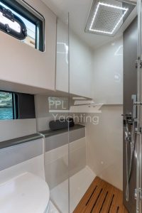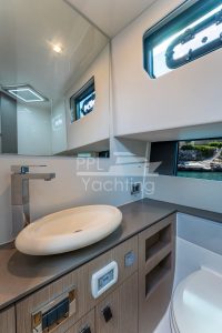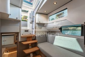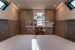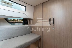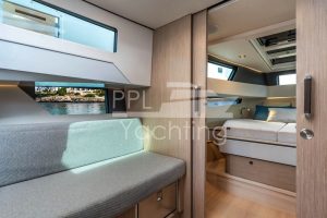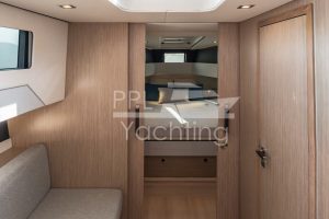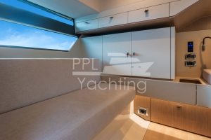 Unter Deck einen gut geschnittenen Salon mit viel Stehhöhe sowie einer zusätzlichen Kühlschublade, zwei großzügige Kabinen über die volle Schiffsbreite (Eigner und VIP), beide mit Doppelbett und ausreichenden Staukapazitäten, um auch auf langen Reisen Komfort zu gewährleisten, sowie das Badezimmer, das sich in dieser Modellreihe durch seine große, separate Duschkabine auszeichnet. Ein Komfortniveau, das Maßstäbe setzt! Der Liegeplatz in der Marina Cala d’Or, Mallorca, kann auf Mietbasis übernommen werden, sofern gewünscht.